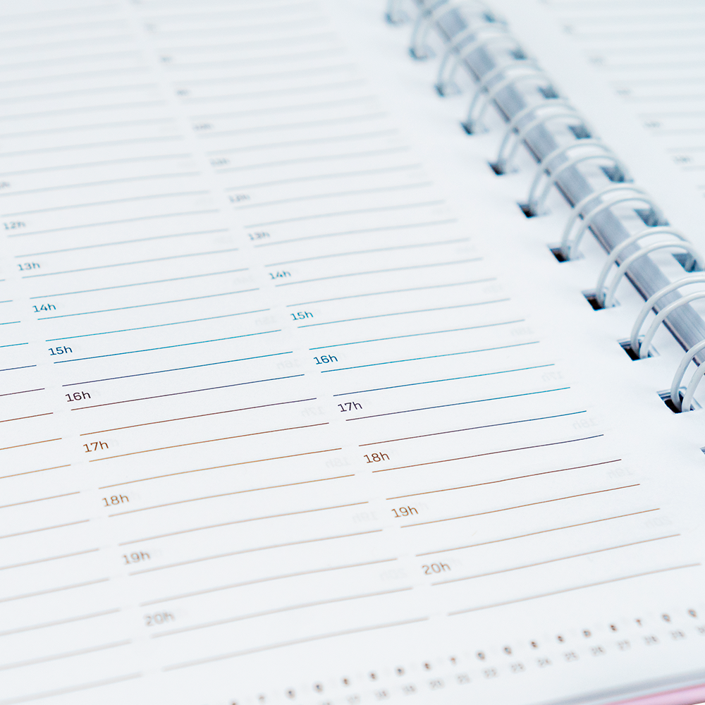 Além de facilitar o planejamento semanal, a agenda semanal é personalizada na capa, o que permite personalizar com a identidade visual da sua empresa, com seu nome, sua foto ou como preferir, e ainda permite usar a agenda com as datas separadas pelo dia do mês e pela data da semana.