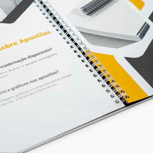 A apostila é um material didático com encadernação cristal e wire-o branco. Ela possui uma lâmina em couro preto, a impressão pode variar de 10 a 300 páginas e serve como material de aprendizado em faculdades, colégios, cursos, escolas técnicas, igrejas, autoescolas, apostilas de concursos e outros nichos que precisam seguir uma jornada educacional eficaz.