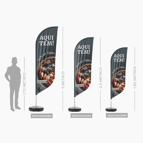 Esse Wind Fly Banner é um kit completo para piso em 5 modelos: Faca, Pena, Vela, Ângulo e Retangular. Produzimos 3 medidas (P, M e G):